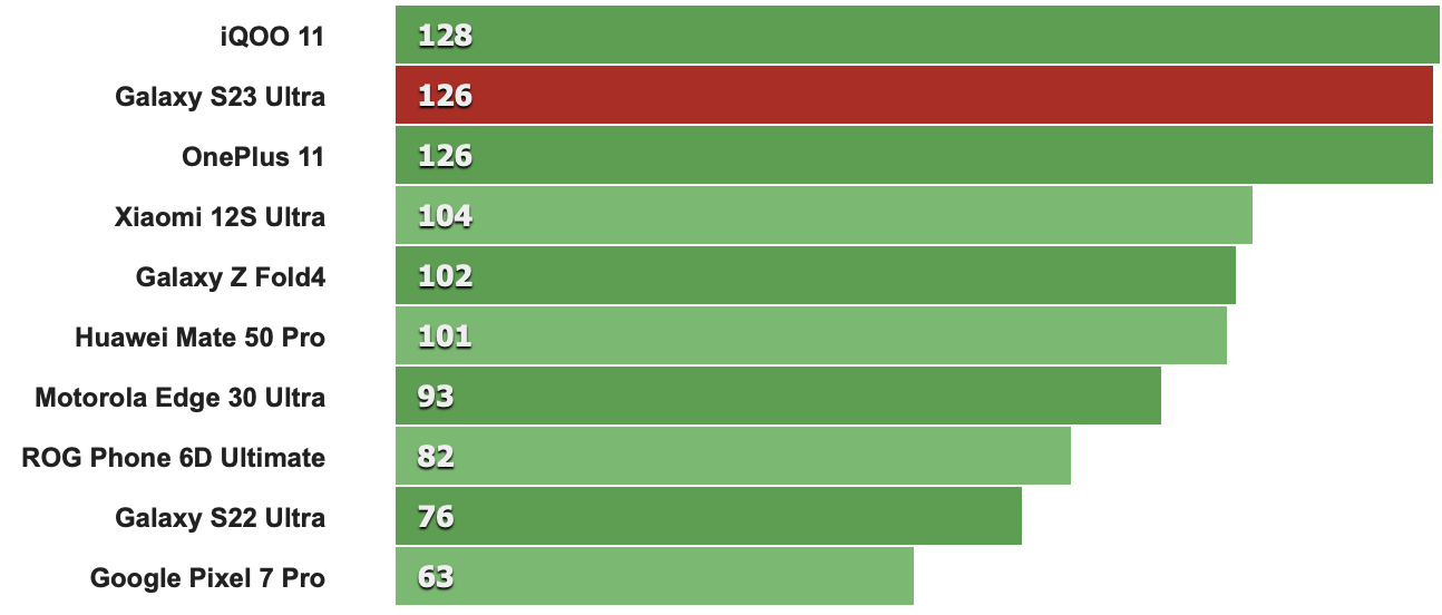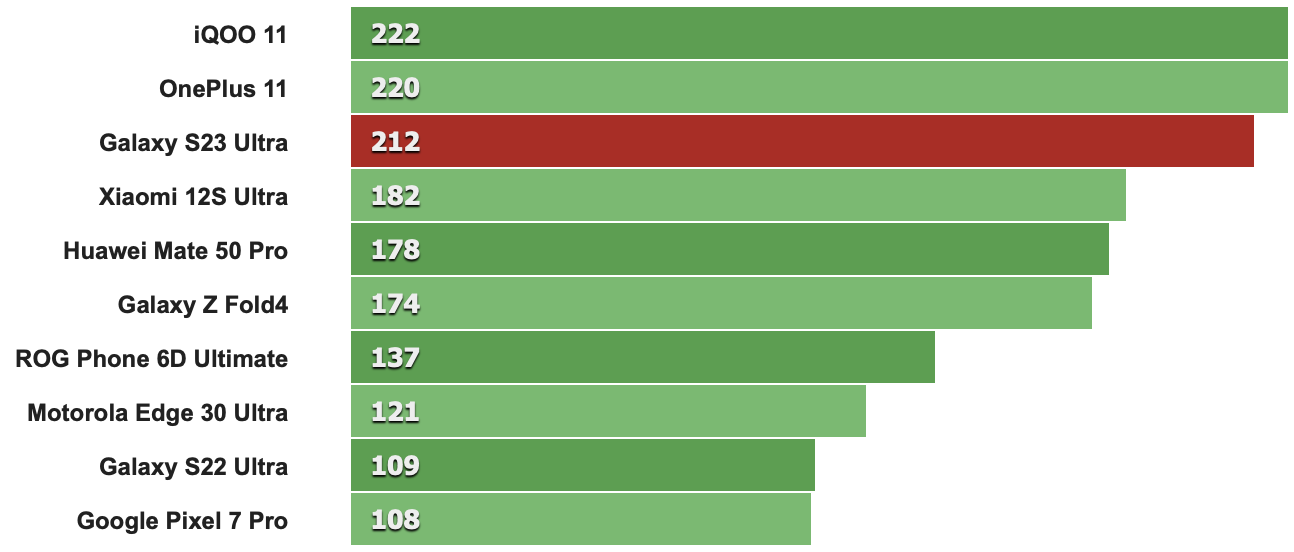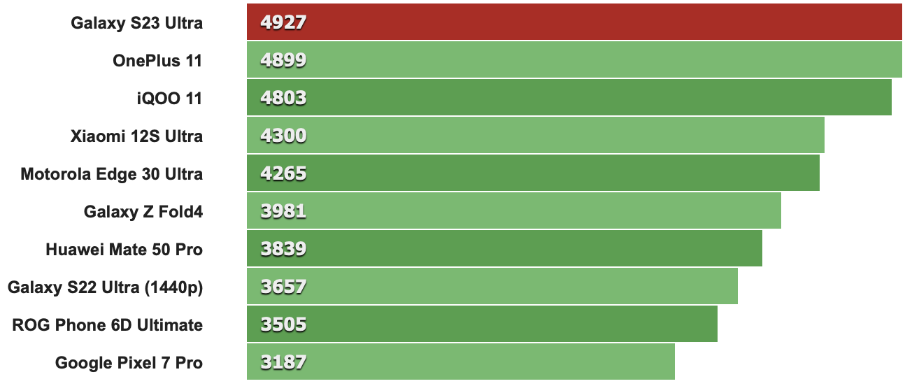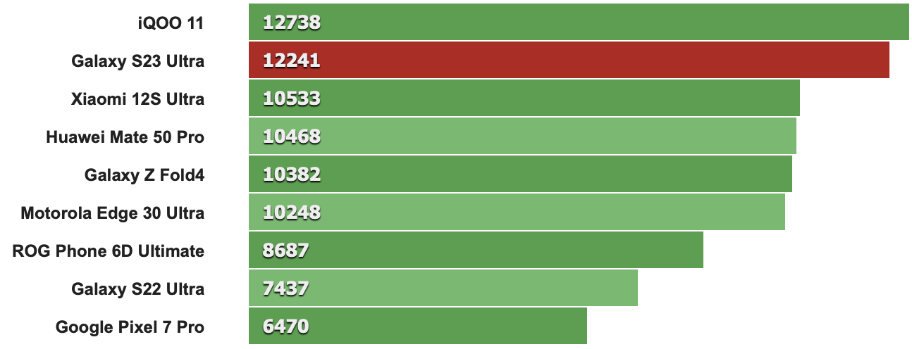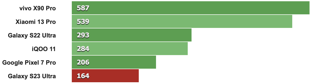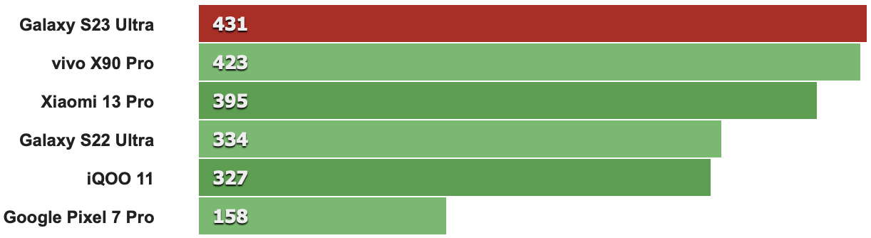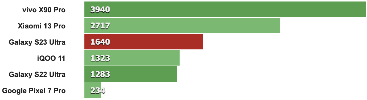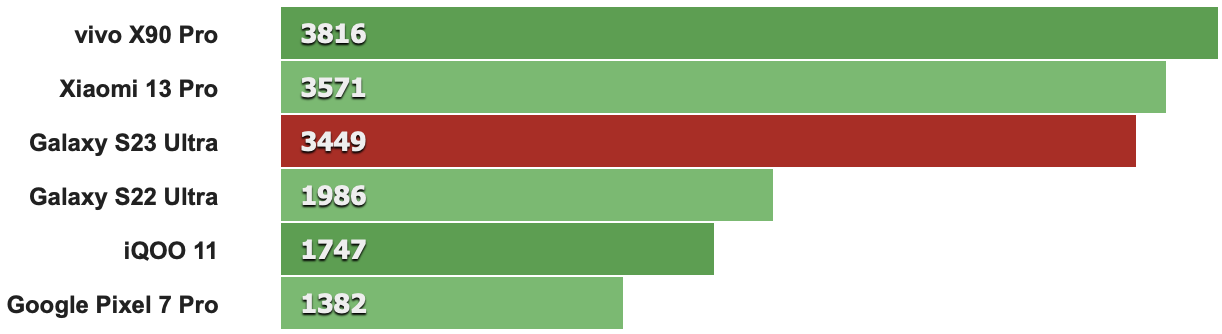 以下跑分先從CPU單核性能來看,特定版Snapdragon 8 Gen 2時脈多了0.17GHz確實讓S23 Ultra比其它採用標準版Snapdragon 8 Gen 2的同級機款分數來得高(例如第二名的IQOO 11就是搭載標準版Snapdragon 8 Gen 2)。