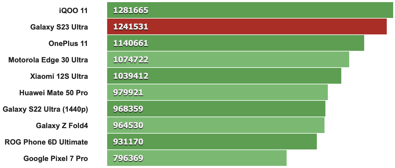 AnTuTu 9這個項目是測試手機「多執行緒」、「Android執行環境」、「RAM運算」、「RAM速度」、「CPU整形性能」、「CPU浮點運算」、「單線程CPU整形性能」、「單線程CPU浮點性能」、「2D繪圖性能」、「3D繪圖性能」、「存儲I/O」、「數據庫I/O」的綜合效能,測試繪圖性能時,手機螢幕是在開啟下進行。S23 Ultra實際上反而小輸iQOO 11,但嬴過OnePlus 11,值得注意的是,這是一連串測試下來的結果,先前已先跑了上面兩支測試程式了,因為手機的溫度控制也會影響這裡的成績,也就是說,IQOO 11的散熱或許做得比較好才讓它即使在時脈上低於S23 Ultra的,但在這個測目目反而領先。