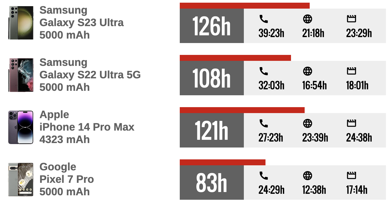 綜上所述,iPhone 14 Pro Max在螢幕開啟兩項測試中(網頁連續觀看及影片連續播放)仍然具有優勢,但在語音通話和待機部分表現相對比S23 Ultra弱,因此綜合下來在整體續航力獲得121小時,比S23 Ultra少了5小時。