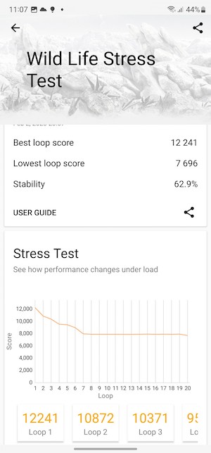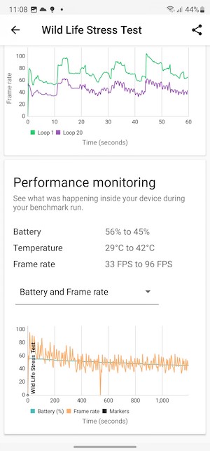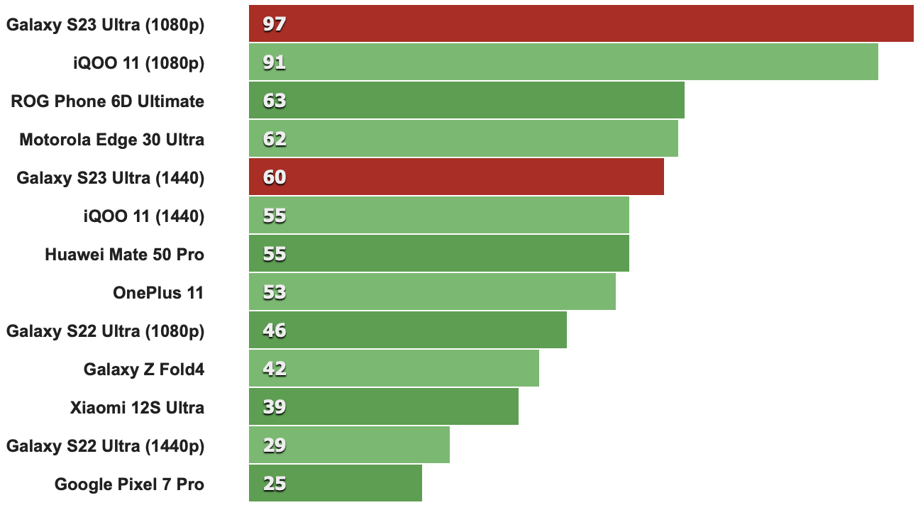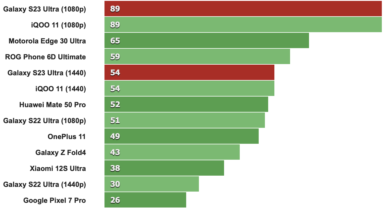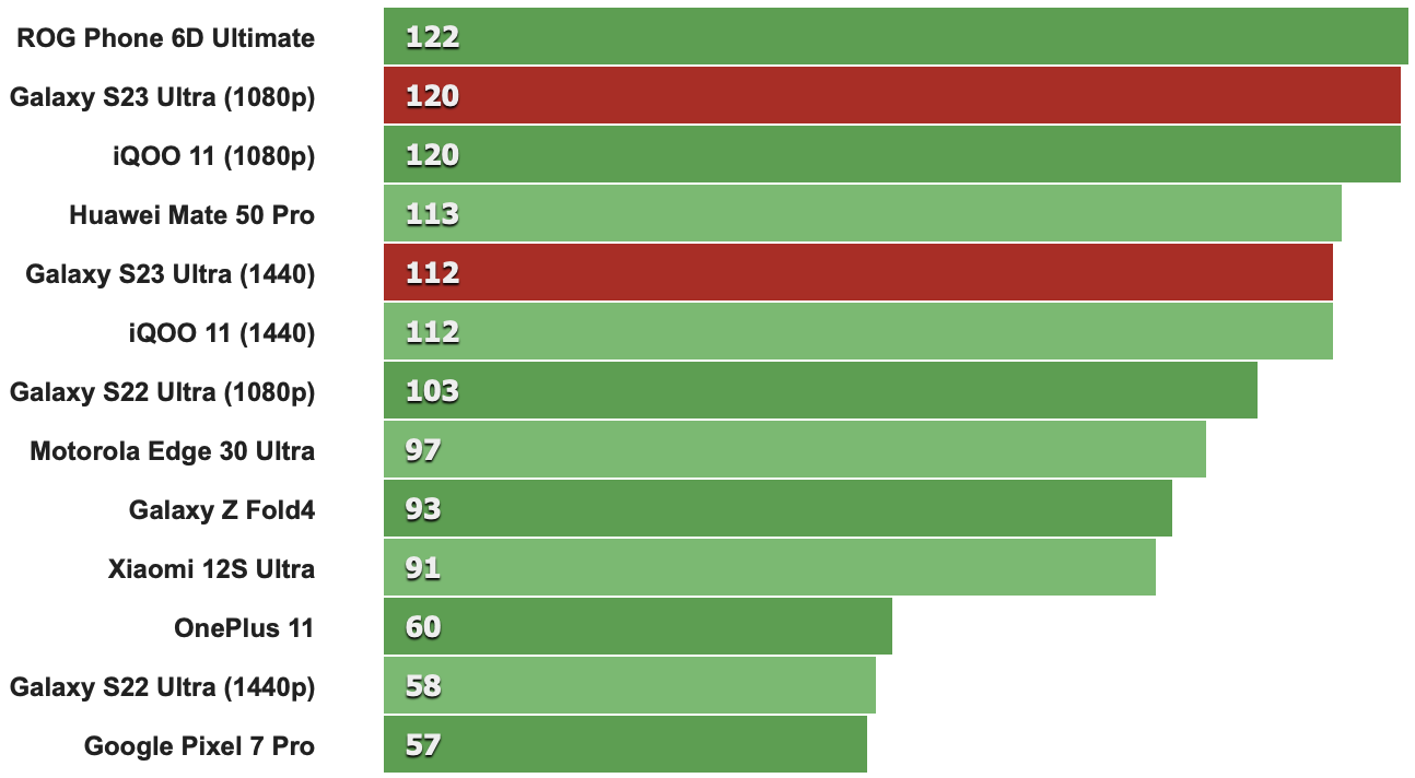 在螢幕關閉模式的測試項目中,Galaxy S23 Ultra表現幾乎與IQOO 11和OnePlus 11相同,每秒只差1到2個幀而已。這個微小的差異可以在底下3DMark Wild Life Extreme觀察到,但明顯的差異還是需與2022年的機款相比才比較明顯。