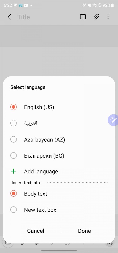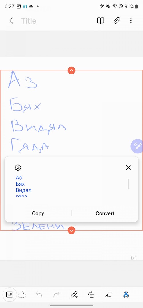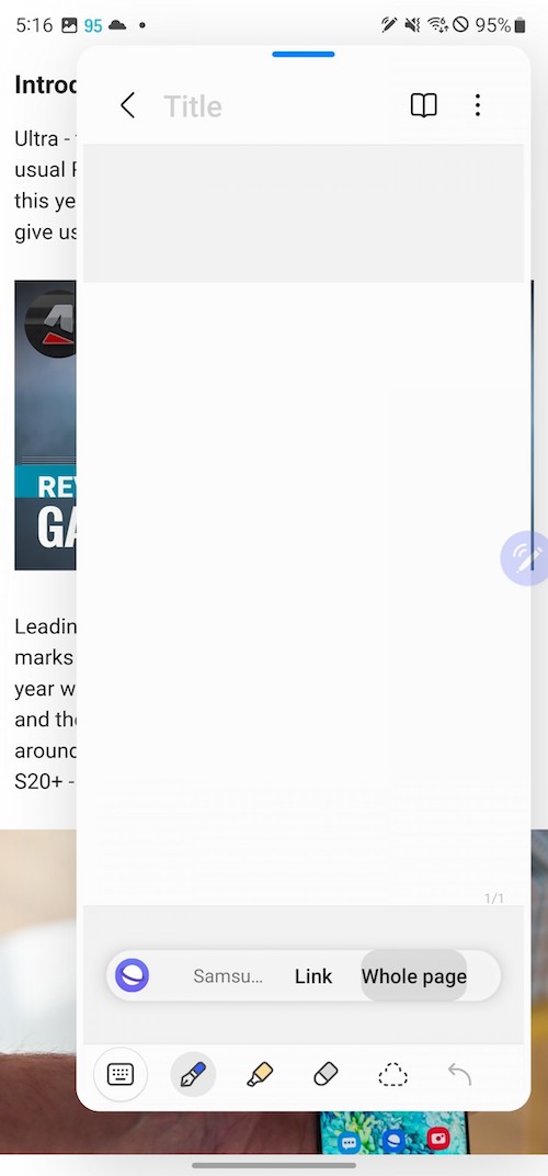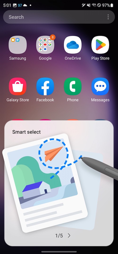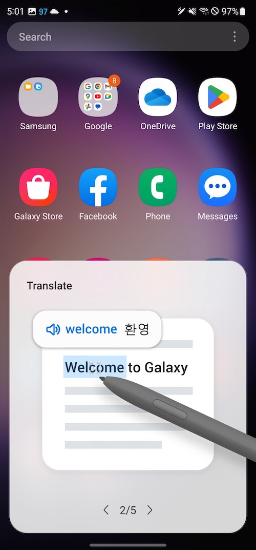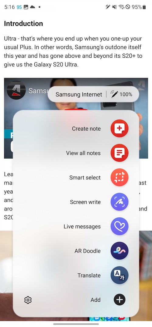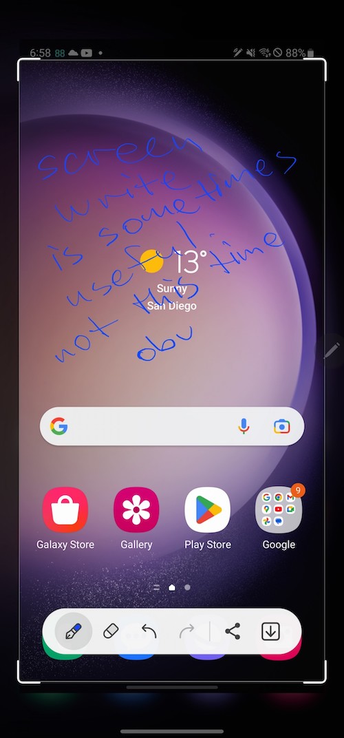 進階螢幕截圖功能是S Pen的主要應用之一。智慧選取(Smart select)能讓你做不同形狀的截圖,將截圖當中的文字轉成可編輯的文字,或將它們釘選在螢幕上。此外還可以在截圖中加入GIF動畫特效。Screen Write則是將整張螢幕截圖後,選擇不同種類的筆觸與筆刷在上面進行塗鴉或筆記(也可以再裁切)。Screen Translate可讓S Pen單字翻譯,無法做整句翻譯,方法是先選好看你要翻成什麼語言,然後將S-Pen懸停在文字上時就會看到已幫你翻譯好的彈窗。