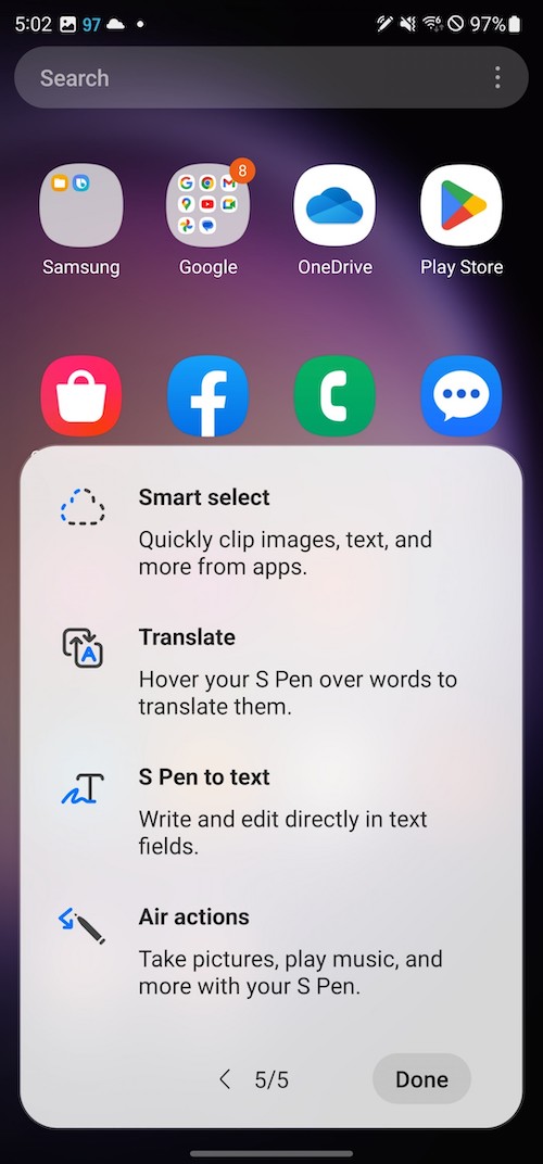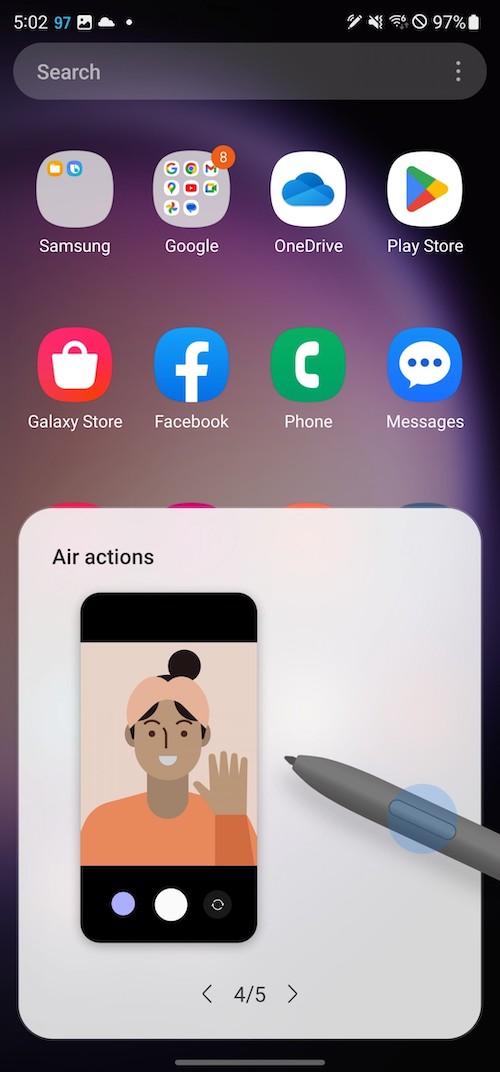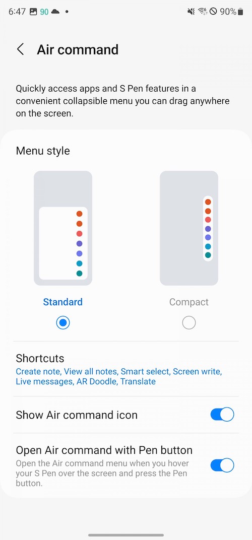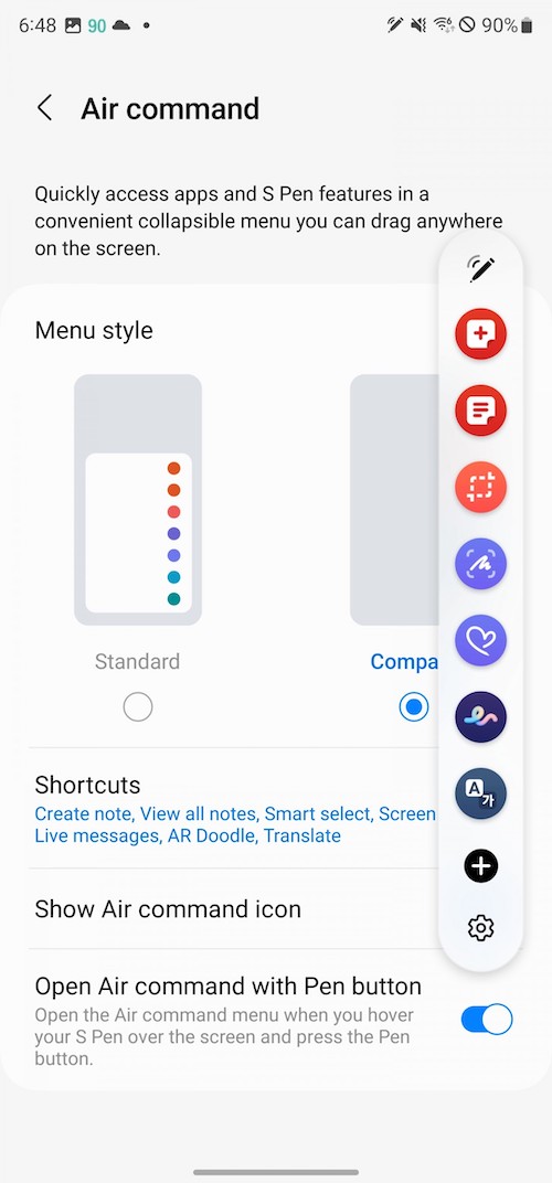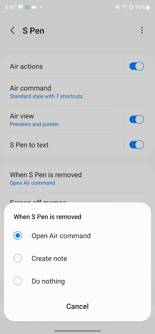 另一個情況時,當手機在解鎖狀態下你抽出S Pen時,會彈出「Air Command」選單,這是預設的設定,你可以將它關閉。「Air Command」選單上的功能可以自訂,可以是S Pen的其它功能或程式的捷徑。