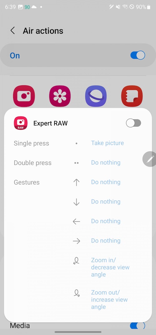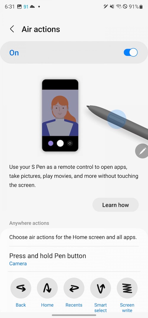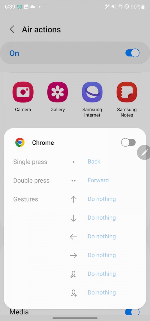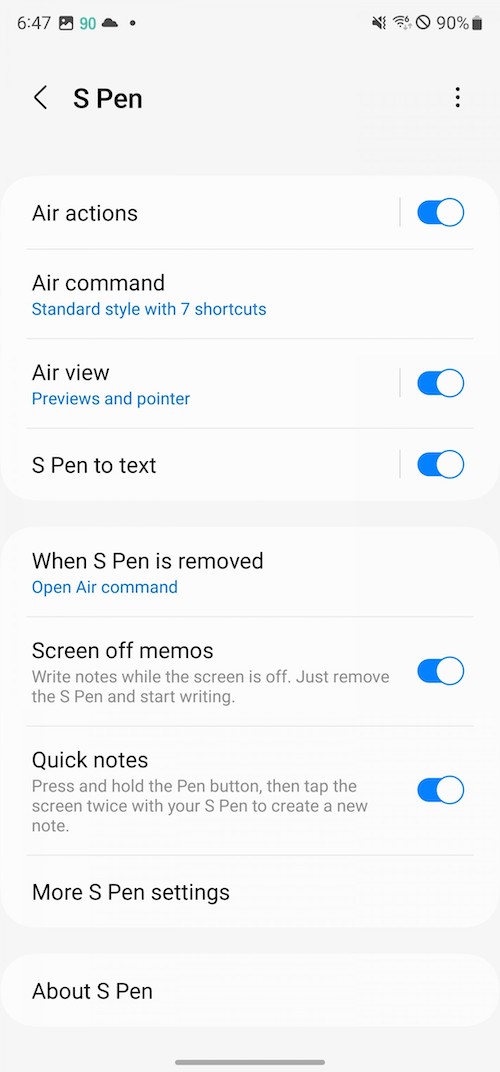 「S Pen unlock」-抽出S Pen即解鎖手機。「Screen off memo」– 螢幕關閉狀態下仍可以使用S Pen做筆記。「Quick create notes」-按著S Pen按鈕不放,接著用S Pen在螢幕點二下就可以新增筆記。「S Pen to text」-將書寫筆跡轉換為文字輸入。「Air view」– 懸浮預覽,例如相簿裡將筆停留在相片上方時可以放大預覽。「Show pointer when hovering」-懸停時顯示筆尖的小圓點。「Allow multiple S Pens」-當S Pen在S22 Ultra的筆筒倉時,允許使用另一支S Pen,開啟此功能可能會耗電。「Keep S Pen connected」-保持S Pen的連線,好讓它在你從手機抽出S Pen時可以馬上使用Air actions,開啟此功能會增加電池的用電