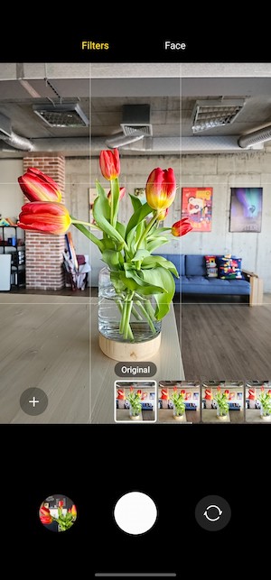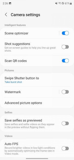 設定的捷徑位於螢幕左上角,影片和照片的拍攝設定選項並沒有獨立開來,因為當中可以調整的選項總體來說並沒有很多。例如參考格線、地理定位和一些常用的項目,就這樣。你還可以選擇關閉或開啟場景優化功能。