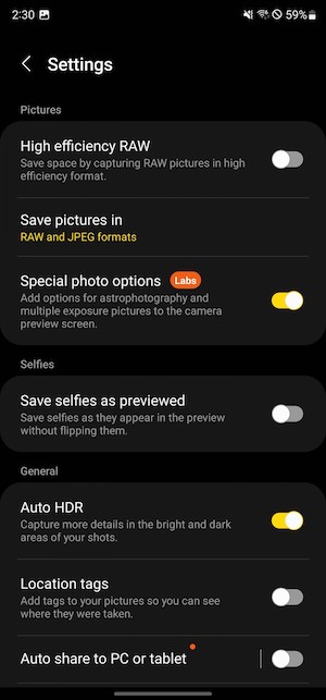 專業RAW模式現在成為相機應用程式中的一個模式,不再像之前是獨立的應用程式,但你仍然必須解鎖手機才能使用(透過在螢幕鎖定畫面的快速啟動相機程式捷徑無法直接進入此模式),而且它也無法放在觀景窗的模式切換選單上,你必須從「更多」標籤中來執行它,這樣的限制還蠻奇特的。