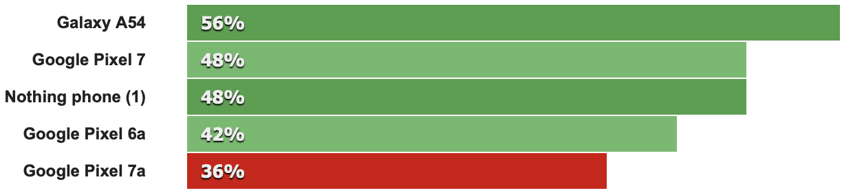 Tensor G2也是款較沒效率的晶片,意謂執行同樣的工作它會消耗較多的電力並產出較多的廢熱,而且積聚的熱氣在尺寸相對較小的Pixel 7a內部空間裡消散的會比較大尺寸的Pixel 7慢。實測時,僅經過10分鐘力壓力測試,Pixel 7a的性能就掉到剩80%,如果環境溫度更高的話,這個數字會更低。若與Nothing Phone (1)做比較,其採用高通Snapdragon 778G+晶片,在運算速度比Pixel 7a的Tensor G2慢,但隨著壓力測試的時間過去,Tensor G2會遺失更多性能,獲得的分數比778G+還低,反觀778G+可以更久地維持在一定的性能。