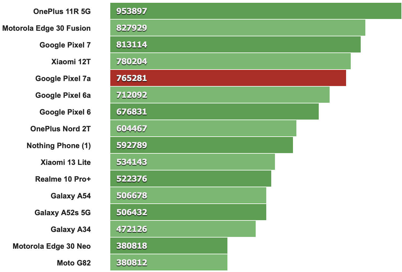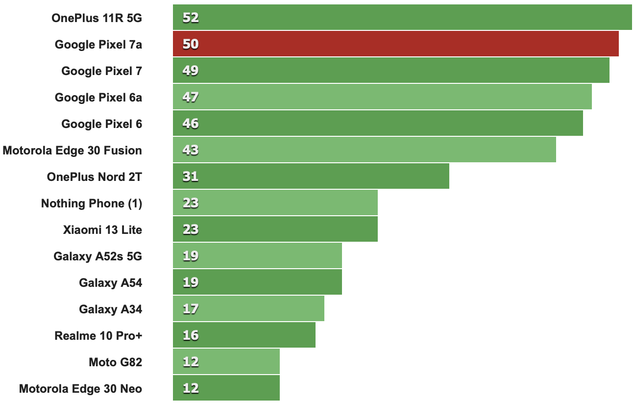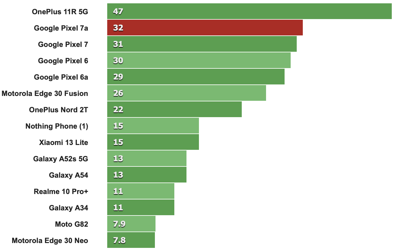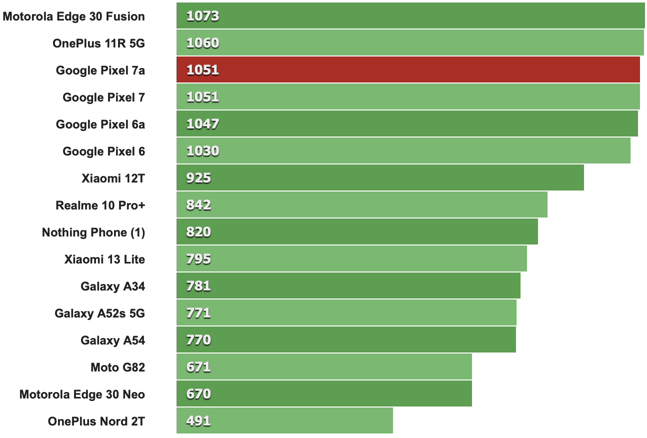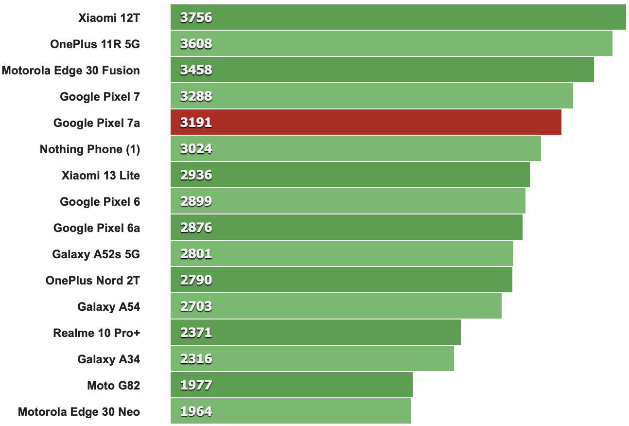 Pixel 7a憑藉特別強大的GPU性能在同級基準測試中表現出色。然而,Tensor G2的問題不在基準測試項目,它面臨與非高通品牌晶片相同的優化問題,就是開發人員通常不會針對這款晶片進行優化,反觀採用Snapdragon晶片的其他手機廠商,其開發人員就會針對旗下推出的手機為晶片進行優化。因此會導致Pixel 7a性能不是那麼令人滿意-與更慢的高通晶片相比,在G2上面跑的的應用程式經常會有卡頓或感到吃力的情形。