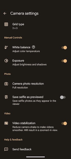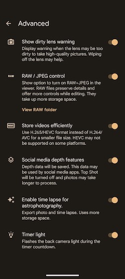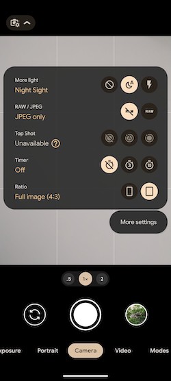 相機程式介面相對簡單,底部是相機模式列表,其它選項則隱藏在一個下拉選單中。切換標準鏡、超廣角鏡及數位變焦模式在此都看得到。它沒有pro模式,但你可以在設定中啟用RAW格式拍攝並手動調整曝光、白平衡和對比。