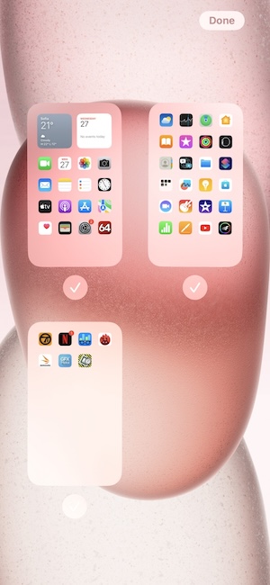 隨著你使用的App變多,你可以在某一個桌面置放某一種類別的App,例如某個桌面全都放遊戲類別的App,另一個桌面全都放工作會用到的App,然後再上班的時候將前者桌面隱藏,或是下班後將全放工作用的App的桌面設隱藏。但最左側的「今日」和最右側的「App資料庫(App Library)」兩個桌面是無法設隱藏的。