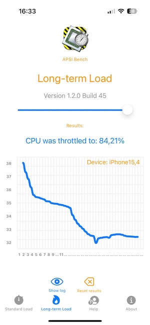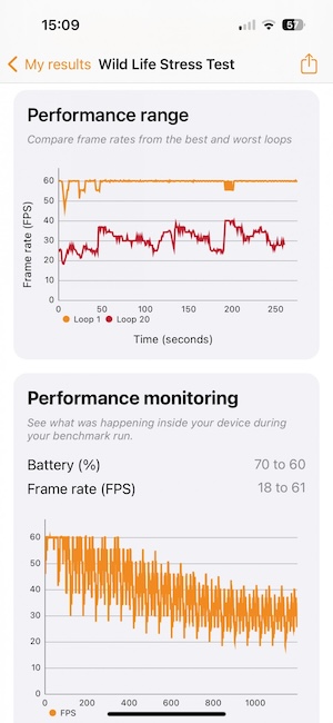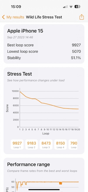 在溫控調頻部分,當iPhone 15執行對GPU負荷較重的工作時導致溫度上升時,會採取較激烈的降頻,從我們所測量得到的結果是,在長時間的負載下,其GPU性能可能會降到只剩一半。