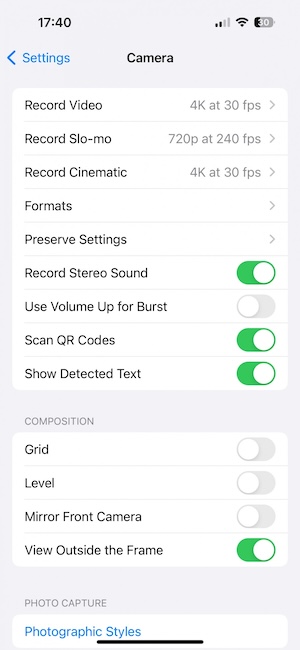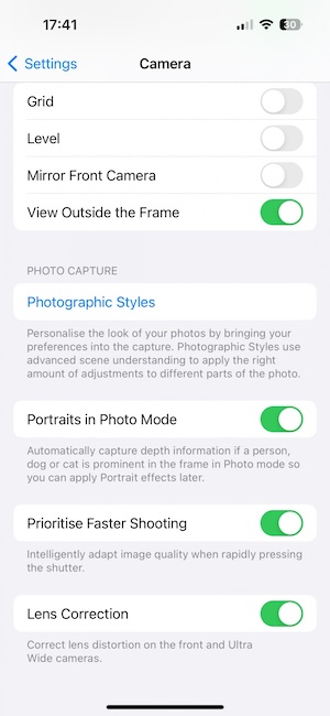 iOS 17的觀景窗大致上與iOS 16一樣,配合背部兩顆鏡頭同步運作與精確校準,你可以即時的看到觀景窗之外的影像內容,方便拍攝時的取景。蘋果在相片處理功能包括新的「光像引擎(Photonic Engine)」、以及之前就有的智慧HDR、夜間模式、深度融合。