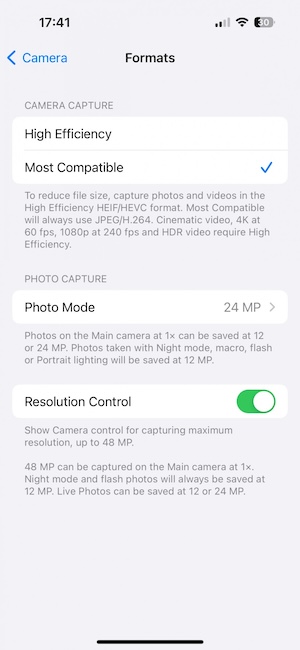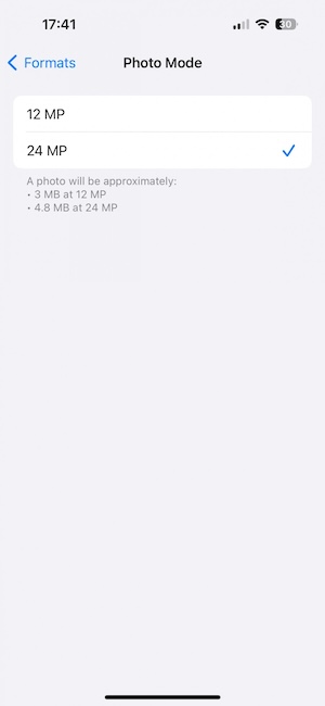 主鏡頭和超廣角鏡頭都支援人像模式。標準版的iPhone 15尚不支援RAW格式(只有Pro系列的iPhone才有此功能)。今年你可以選擇以新標準的2400萬畫素解析度進行拍攝。在相機程式的設定中你可以選擇以1200萬或2400萬畫素儲存照片(從「設定」>「相機」>「格式」,然後進到「照片模式」就有12MP和24MP二種畫素選擇),若要儲存為4800萬畫素,則需要透過觀景窗介面的「JPEG Max」開關開啟(從「設定」>「相機」>「格式」,然後將「解析度控制項目」開啟)。以下我們會幫大家分析不同畫素的相片差異。