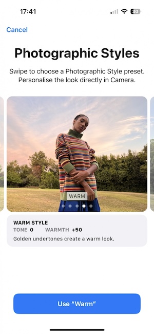 攝影風格(Photographic Styles,iPhone 13之後加入的功能),此功能會自動編輯你的照片,一次針對一個元素進行修改(例如對主題和背景套用不同的校正)。透過它你可以標準、豐富對比、鮮明、暖色及冷色五種濾鏡風格,這五種風格都可以各自再依自己的喜好加以調整,然後將你喜歡的設成預設方便快速使用。