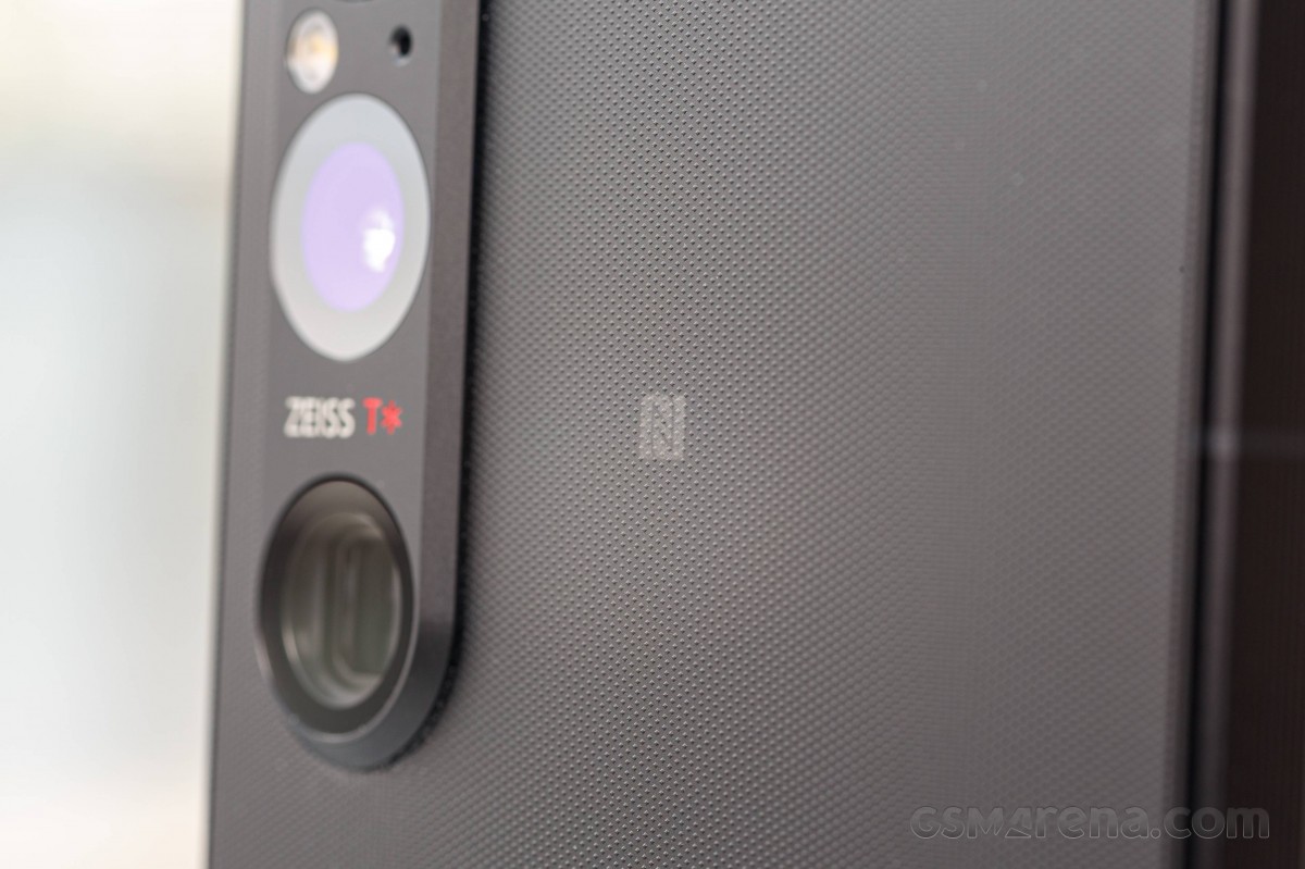 Xperia 1 V的喇叭揚聲器分別位於上方及下方的螢幕邊框與手機中框的交界處。上方邊框左側有一顆1200萬畫素前鏡頭和一系列的感測器。