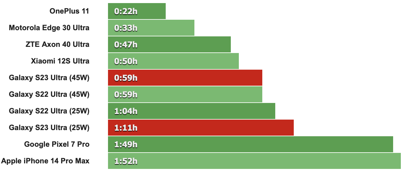 結果顯示,當使用三星自家45W充電器,S23 Ultra充半小時可充到68%電量,完全充飽約要一小時,與S22 Ultra相比可能沒有實質性改進,但還是有一些些。若與iPhone 14 Pro Max或Google Pixel 7 Pro相比,S23 Ultra在半小時和完全充飽的表現都很好多,尤其是完全充飽這個項目明顯優異。