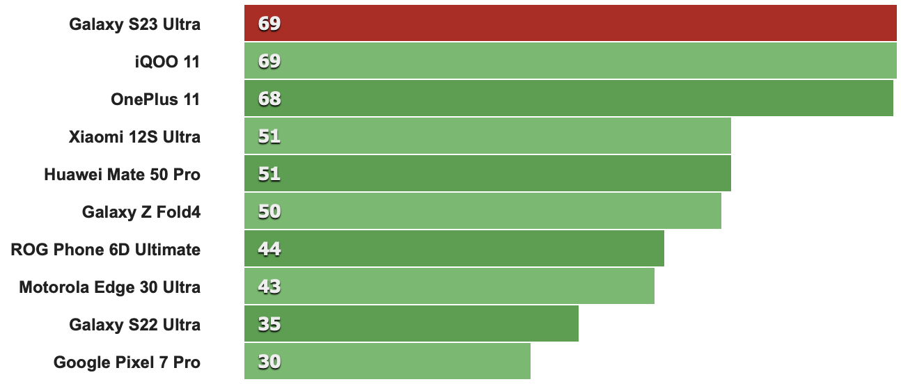 以下跑分先從CPU單核性能來看,特定版Snapdragon 8 Gen 2時脈多了0.17GHz確實讓S23 Ultra比其它採用標準版Snapdragon 8 Gen 2的同級機款分數來得高(例如第二名的IQOO 11就是搭載標準版Snapdragon 8 Gen 2)。