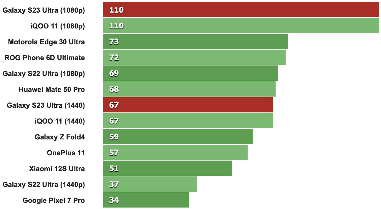 在螢幕關閉模式的測試項目中,Galaxy S23 Ultra表現幾乎與IQOO 11和OnePlus 11相同,每秒只差1到2個幀而已。這個微小的差異可以在底下3DMark Wild Life Extreme觀察到,但明顯的差異還是需與2022年的機款相比才比較明顯。