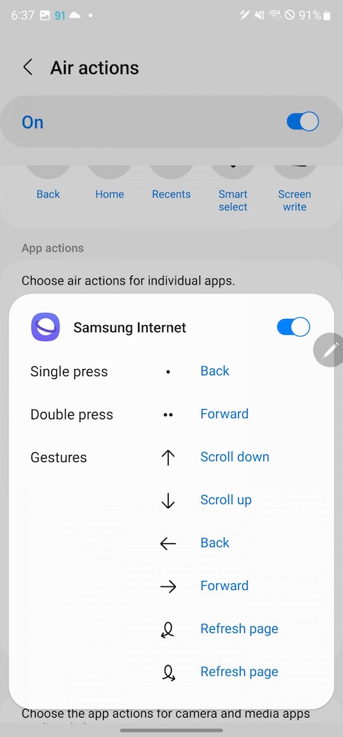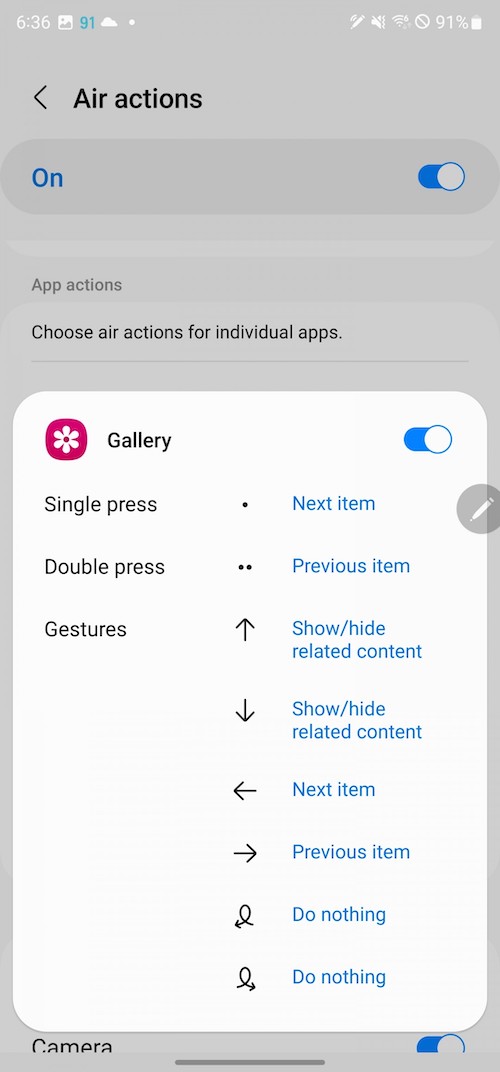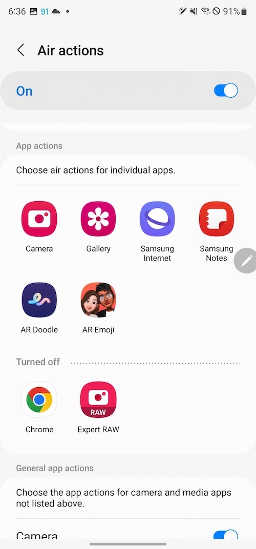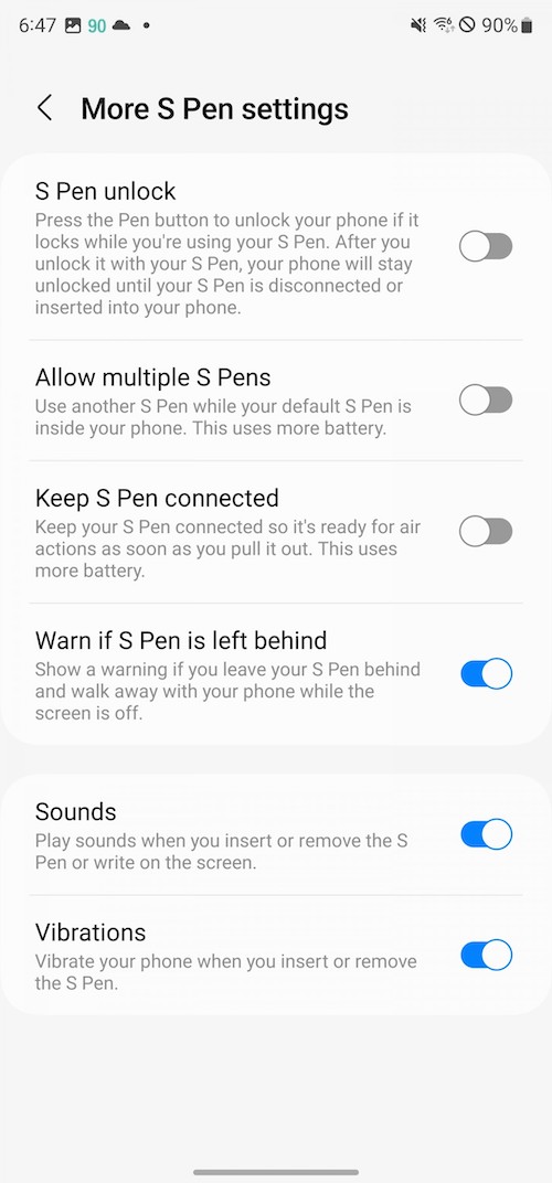 「S Pen unlock」-抽出S Pen即解鎖手機。「Screen off memo」– 螢幕關閉狀態下仍可以使用S Pen做筆記。「Quick create notes」-按著S Pen按鈕不放,接著用S Pen在螢幕點二下就可以新增筆記。「S Pen to text」-將書寫筆跡轉換為文字輸入。「Air view」– 懸浮預覽,例如相簿裡將筆停留在相片上方時可以放大預覽。「Show pointer when hovering」-懸停時顯示筆尖的小圓點。「Allow multiple S Pens」-當S Pen在S22 Ultra的筆筒倉時,允許使用另一支S Pen,開啟此功能可能會耗電。「Keep S Pen connected」-保持S Pen的連線,好讓它在你從手機抽出S Pen時可以馬上使用Air actions,開啟此功能會增加電池的用電