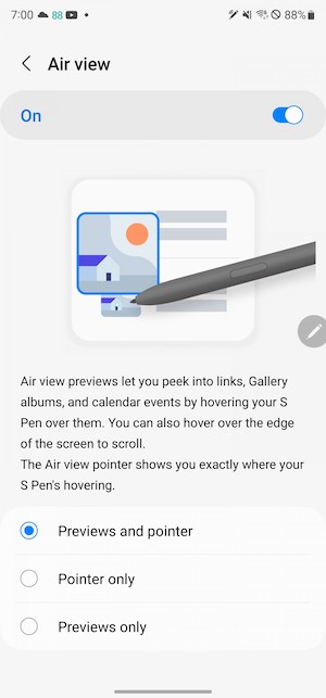 作為Air View應用的一部分,S Pen還有許多其他較細部的功能,例如日曆程式中懸停某個活動上可以預覽該活動細節,在相片程式裡將S Pen懸停在圖像上時可以放大預覽,S Pen在螢幕上下邊緣懸停來上下捲動畫面,在網址連結懸停可以預覽網頁。