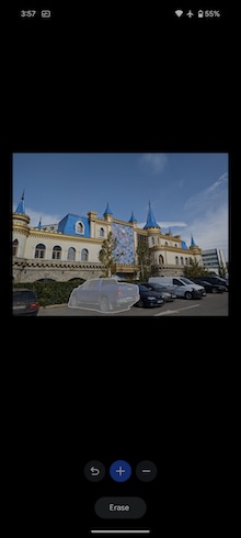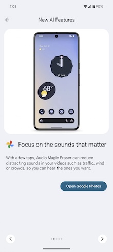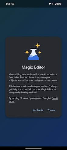 最後,現在運算力更強大的AI演算法也應用到Google相簿了。這裡不是指Google One訂閱中所提供的物件橡皮擦或自動景深功能,而是在相簿的編輯選單中,現在多了一個名稱「Magic Editor(暫譯魔術編輯)」的功能按鈕,它提供比標準編輯更進階的功能,讓你可以移除照片中非人物的物件、移到照片中其它地方、或是改天空的畫面等。魔術編輯還提供三個變化功能,而且如果你不喜歡,你還可以生成更多的變化。此外,你還可以移除影片的背景雜音,在某些場景下這個功能有很棒的效果。
