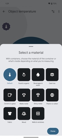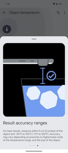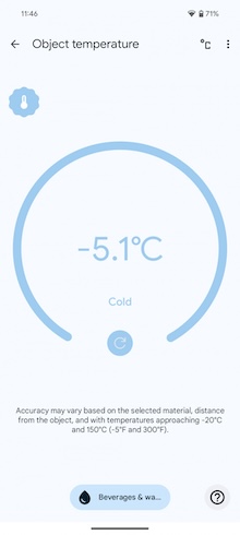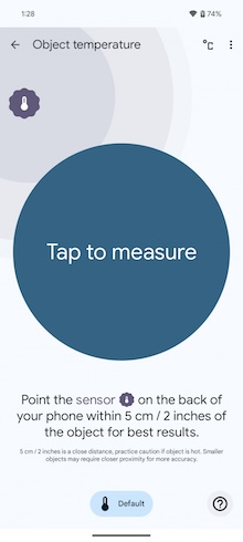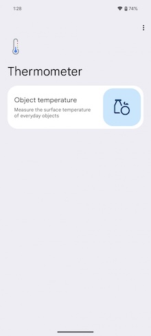 要測量溫度時,你需事先在應用程式中選好你要測量的對象是什麼-整理本篇評測時它尚不支援測量人體體溫。事實上,溫度計應用程式的歡迎畫面看起來還不是很完整的樣子,其歡迎畫面只有一張用於「物體溫度」測量的卡片,所以可能要通過各國的相關監管機構的認可,才有可能加入「人體溫度」的測量功能。
