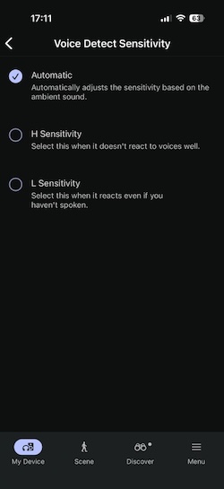 這項功能提供了三種語音偵測靈敏度選項,不過在實際測試時,有幾次因為咳嗽或打噴嚏而觸發該功能,讓耳機以為我在說話。儘管如此,在某些情境下Speak to chat(快速聊天模式)」確實蠻實用的,例如當你在外點餐跟服務人員講話時,不想摘下耳機時,它就可以不用讓你拿下耳機依然可以很清楚的聽到對方的聲音。