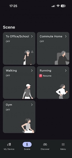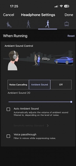 XM6耳機能針對不同活動自動切換功能,例如在搭乘大眾運輸通勤時開啟降噪,而在跑步或走路時開啟環境音模式。它大致上能準確地區分這些活動並開啟對應的功能,如果沒有準確的開啟/啟用,你也可以透過耳機上的觸控按鍵來達到。