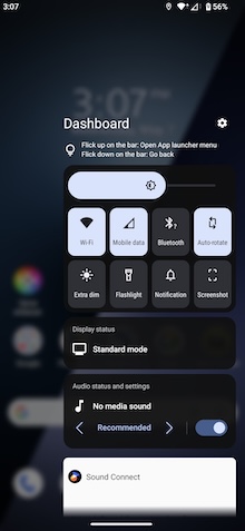 「Side Sense(側邊感應)」是Sony另一個自家功能。點一下這個位於螢幕邊緣的側邊條時,會開啟一個應用程式和功能的選單,此選單上面的項目大部份可以讓你自訂。上述應用程式分割畫面兩兩配對的捷徑也可自訂後放在此選單上。此選單後來加入可以用來控制Sony耳機應用程式的小工具,對於有在使用耳機的用戶很方便。