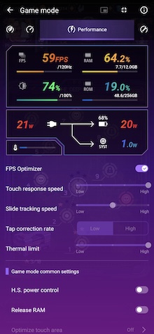 遊戲使用的螢幕更新應用方面,內建的「遊戲增強器」讓你可以調整螢幕更新率,觸控採樣率,以及各種其它設定。例如,在性能模式中,你可以選擇哪些遊戲使用120Hz,其它如果沒特別設定的遊戲就使用平衡模式,此時會限制在69Hz/60fps。但在此不保證所有遊戲都能以超過60Hz來執行,但在實際測試中,我們執行平常會玩到的遊戲,確實可以跑到60Hz以上。