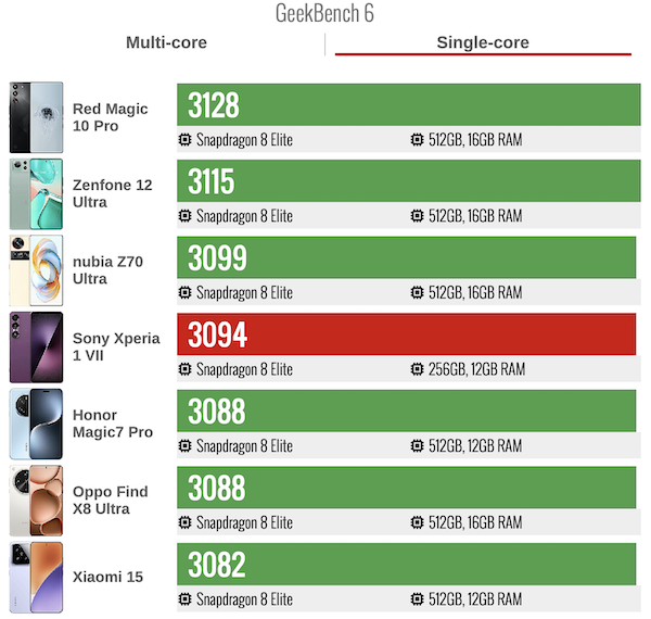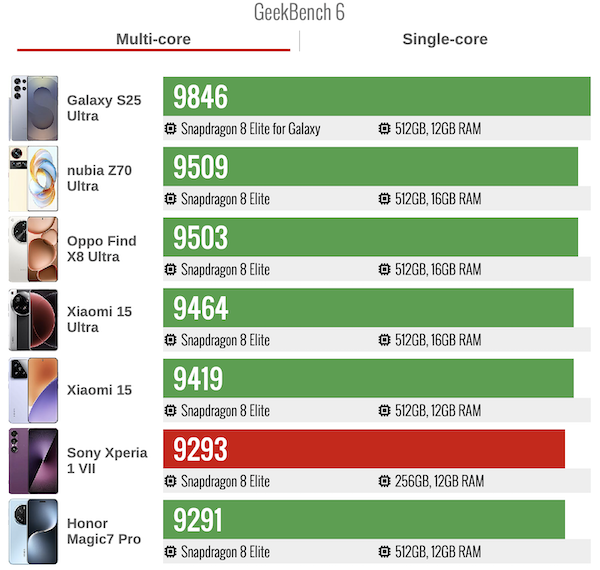 Xperia 1 VII搭載Snapdragon 8 Elite晶片組,預期其帶來旗艦晶片的性能可與其它Android品牌的高階機種媲美;大家也都使用此級距晶片。