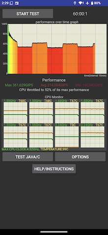 連續負載測試結果同樣也不是那麼厲害。在CPU節流測試部分,性能下降迅速且明顯,在不到8分鐘的時間,數字下降到只剩一開始的52%,接著,手機會以初始效能的50%及60%之間運行-測試圖表的紅色區域比一般手機還多(見以下第一張測試圖表)。