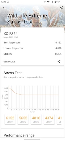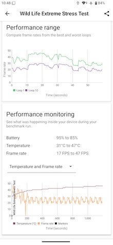 GPU的負載表現就與其它品牌的旟艦相當,在3DMark Wild Life壓力測試中,其分數會降到剩一開始66%左右,然後維持這樣的性能運行。